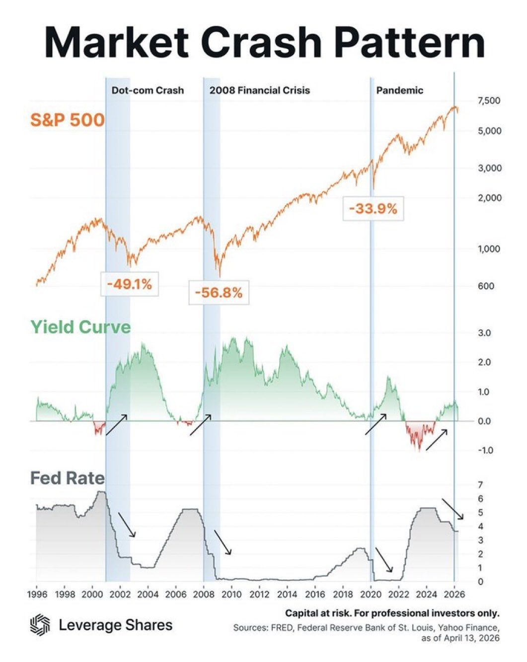 El patrón observado en crisis anteriores suele desarrollarse en varias etapas: primero, la inversión de la curva como señal de alerta; después, un periodo en el que los mercados continúan subiendo ignorando el riesgo; posteriormente, empiezan a aparecer signos de debilidad en la economía real; más tarde, la Fed interviene con recortes; y finalmente, se produce el ajuste brusco en los mercados.