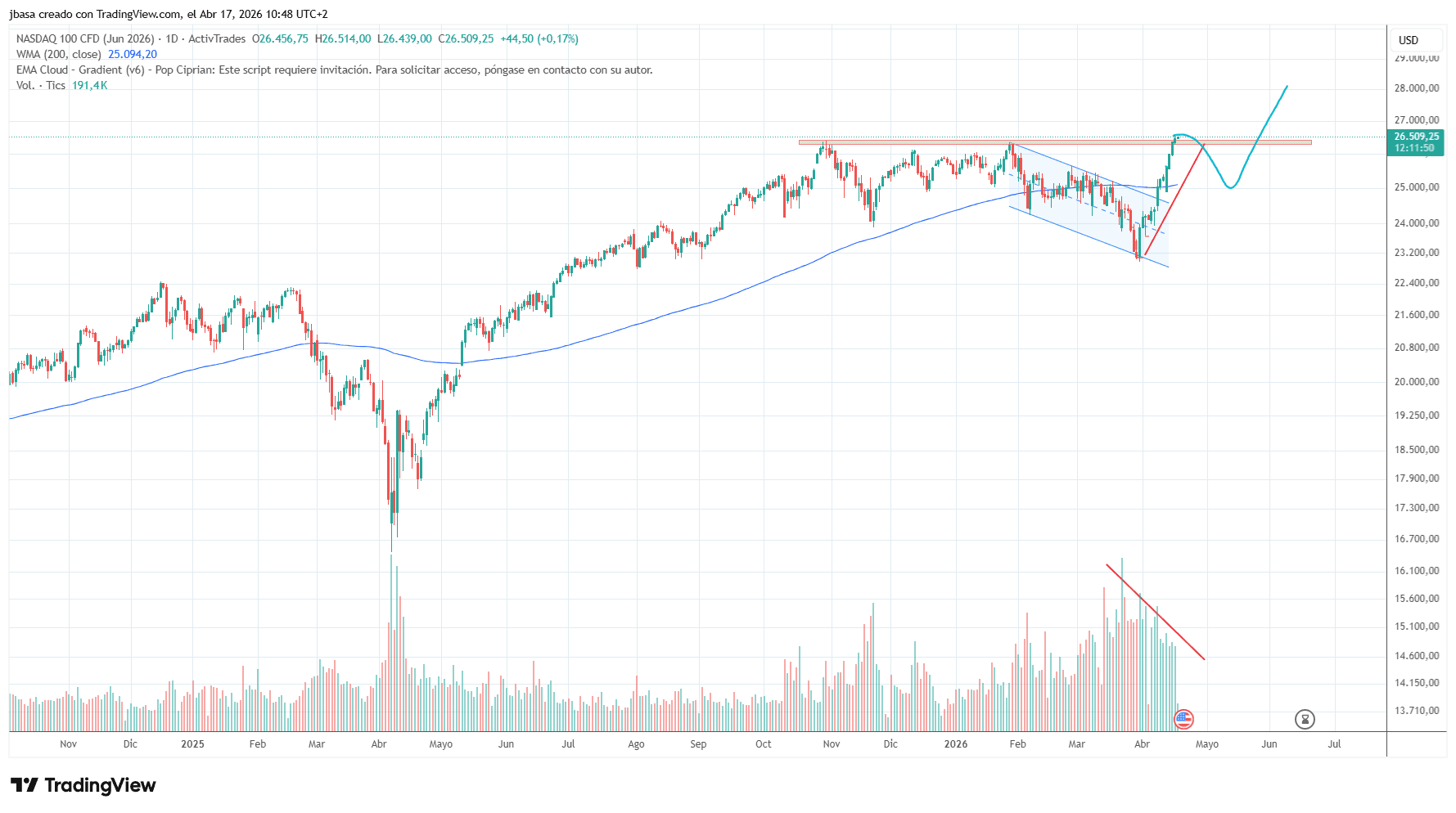 Gráfico del Nasdaq (D1), lectura de TradingPRO.